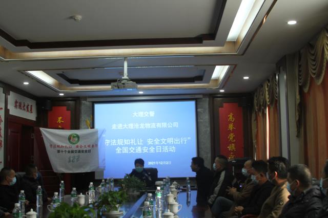 2021年12月2日是第十個"全國交通安全日"。今年"全國交通安全日"的主題是"守法規知禮讓、安全文明出行"。12月2日上午,由大理州公安局交通警察支隊宣傳科科長楊建龍、副科長黃國慶,法制大隊大隊長秦浩洪;大理市交警大隊教導員趙艷、大隊指揮中心副主任何瀟、大理市交警大隊車管所源頭管理辦公室負責人劉惠璋等一行12人組成的宣講組走進大理滄龍物流有限公司,開展第十個"122全國交通安全日"宣講活動。