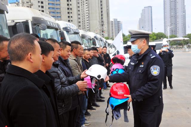 之后,宣講組又在公司停車場舉行了一盔一帶、安全守護宣講及贈送頭盔儀式。
