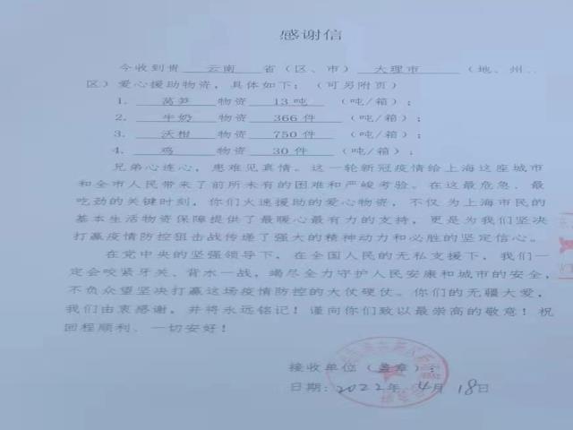 日夜兼程,4月18日第一車物資到達上海浦東新區新場鎮,為疫區人民打贏這場疫情攻堅戰助力。上海浦東新區新場鎮人民為感謝大理人民的愛心援助,還專門寫來感謝信,信中說到:"在黨中央的堅強領導下,在全國人民的無私支援下,他們一定會咬緊牙關、背水一戰,竭盡全力守護人民安康和城市的安全,不負眾望堅決打贏這場疫情防控的大仗硬仗。"