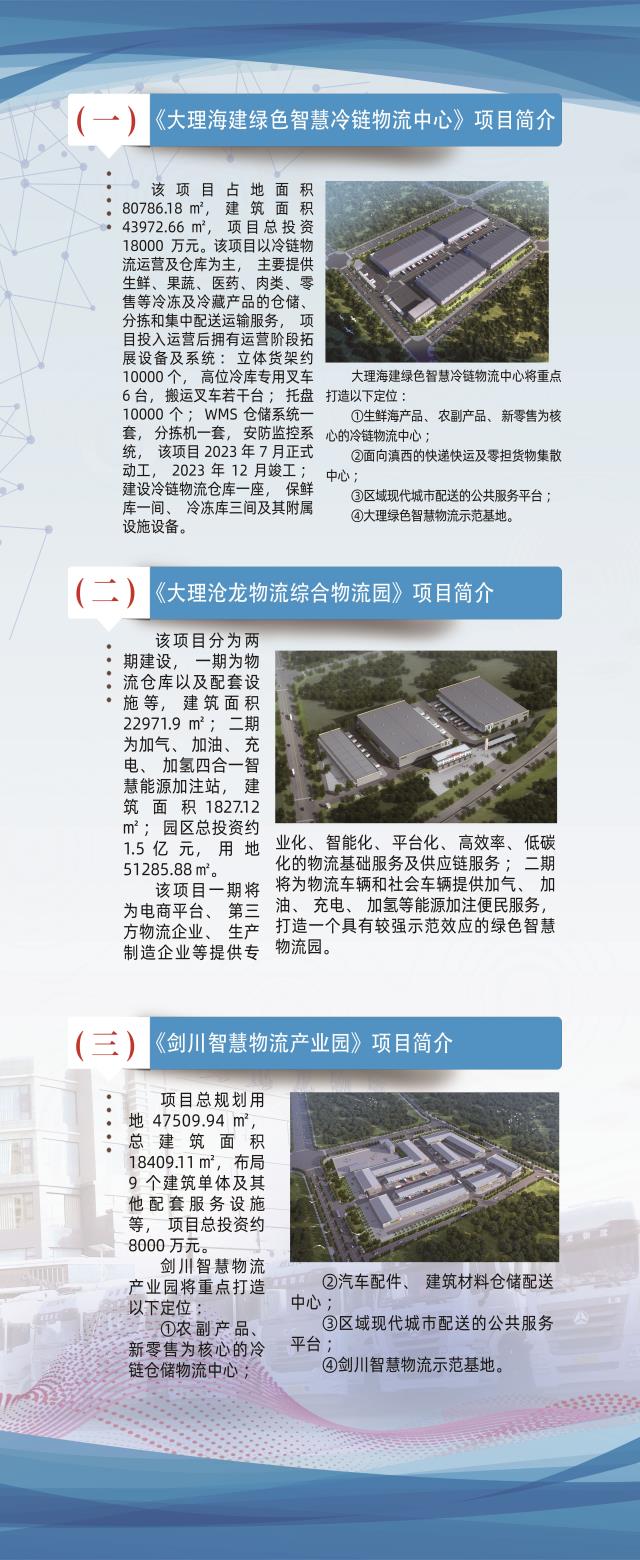 大理海建物流有限公司此次餐博會參展內容為:海建綠色智慧冷鏈物流中心冷庫冷鏈服務、高標倉倉儲、城市配送等;大理滄龍智慧物流園和劍川智慧物流園物流園參展內容為:高標倉倉儲、其他倉儲、區域現代城市配送、建材倉儲配送等公共服務平臺和綠色智慧物流示范基地。