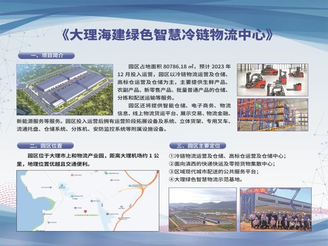 大理海建物流有限公司此次物流博覽會參展內容為:冷鏈物流運營及倉儲、高標倉運營及倉儲為主,主要提供生鮮產品、農副產品、新零售產品、批量普通產品的倉儲、分揀和配送運輸等服務。6
